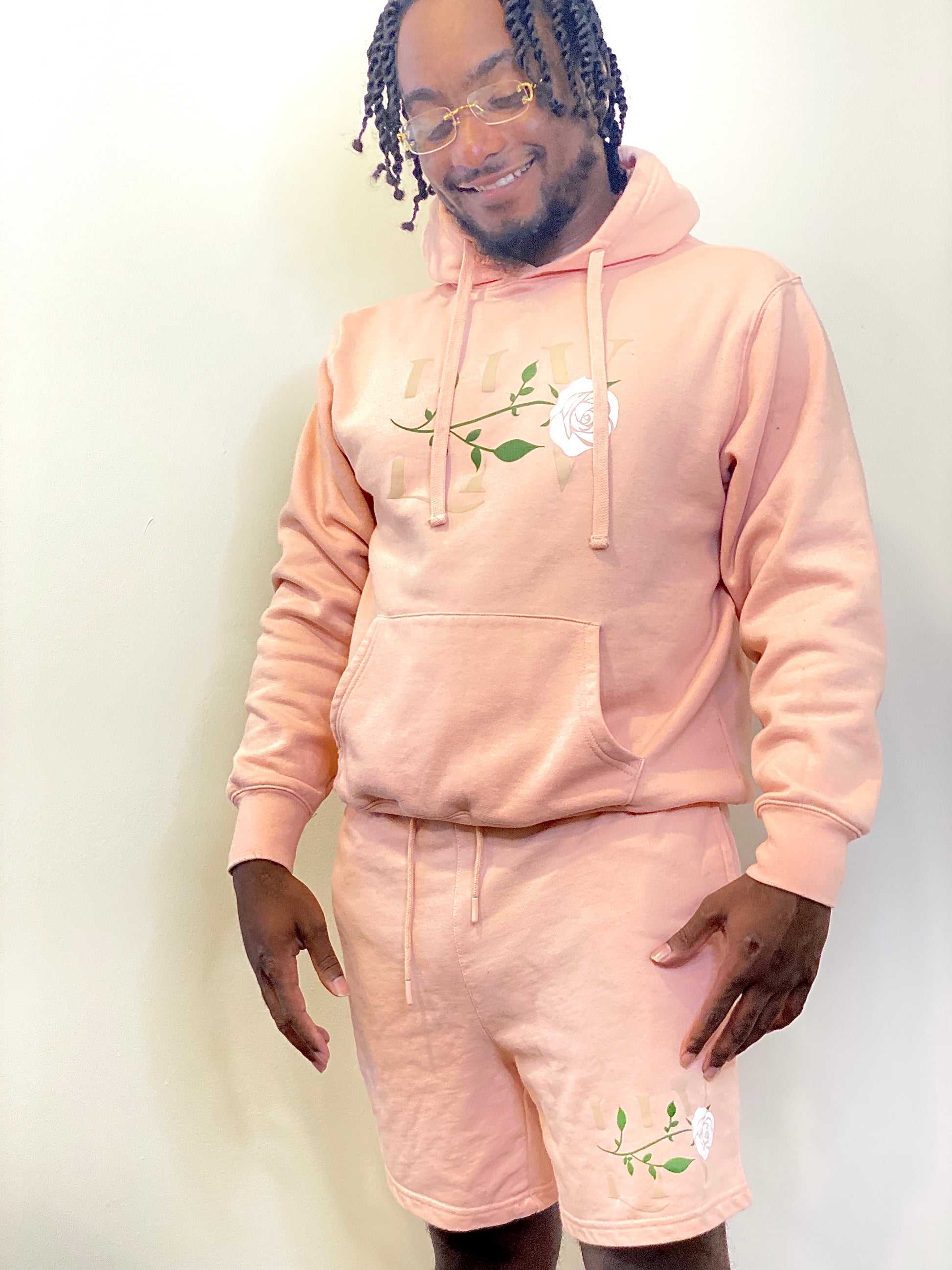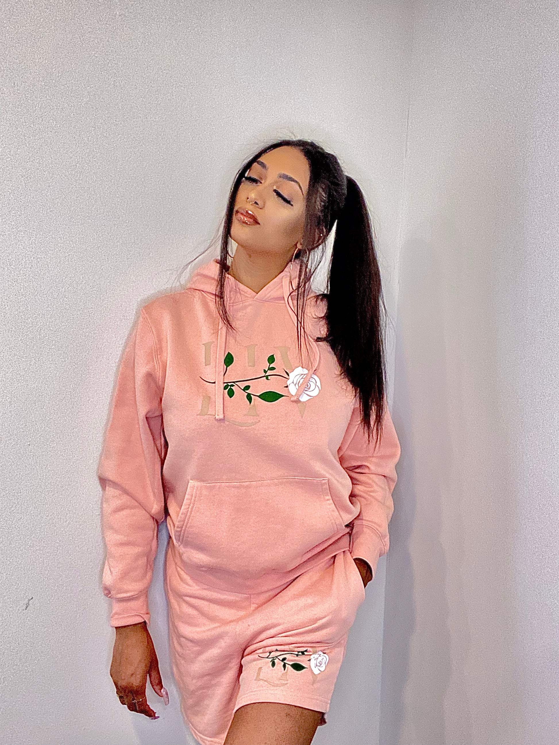 A springtime favorite hoodie and shorts combo. This blush pink colored 2 piece set features our Original LIV Logo in cream with our white rose.