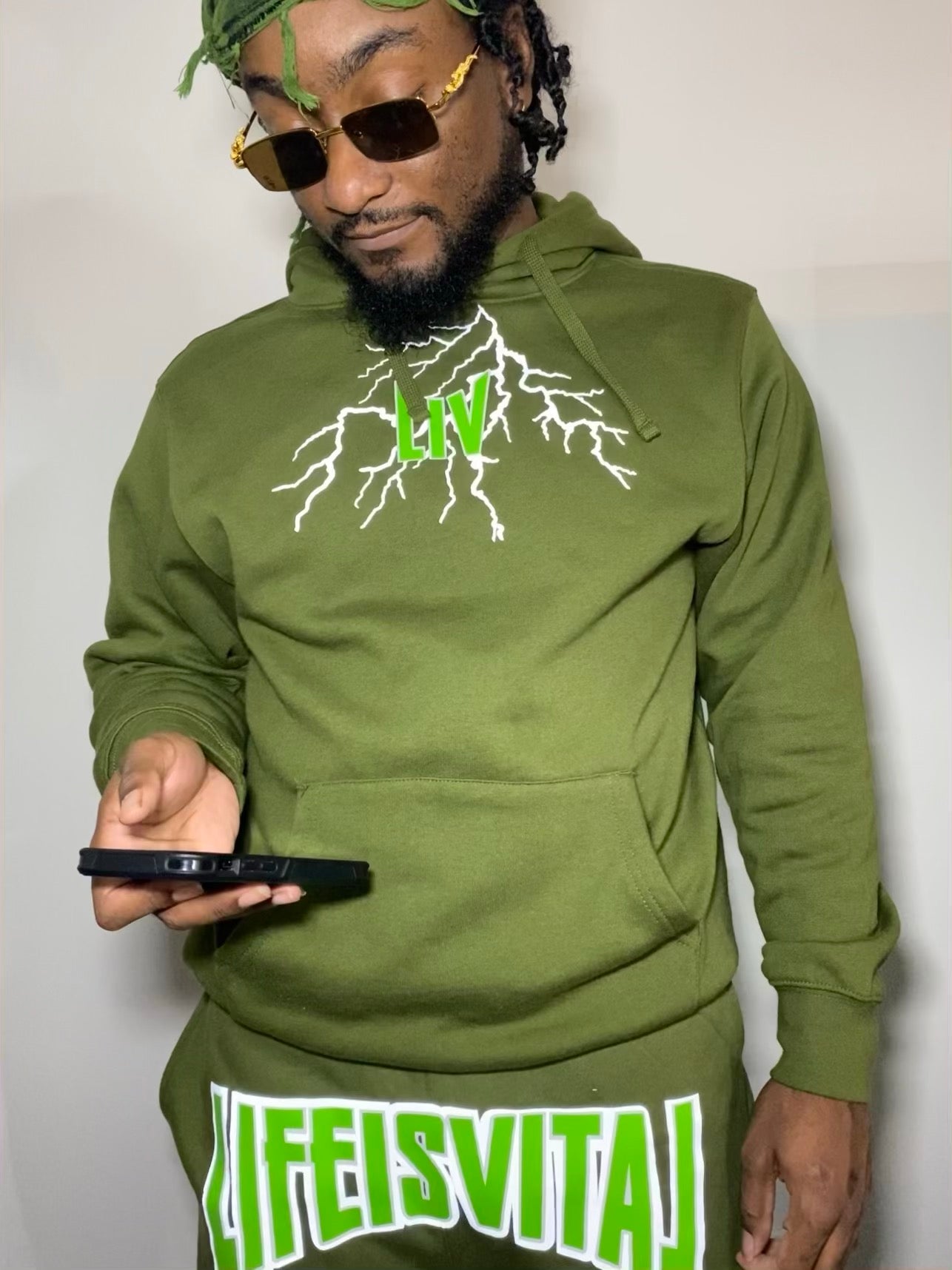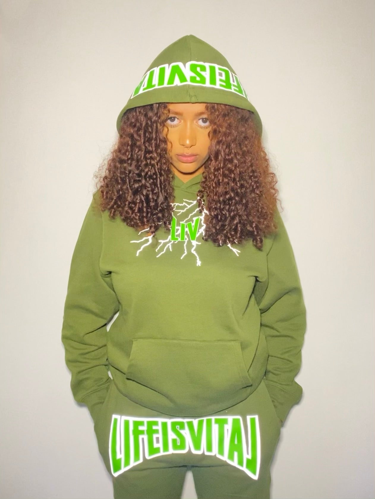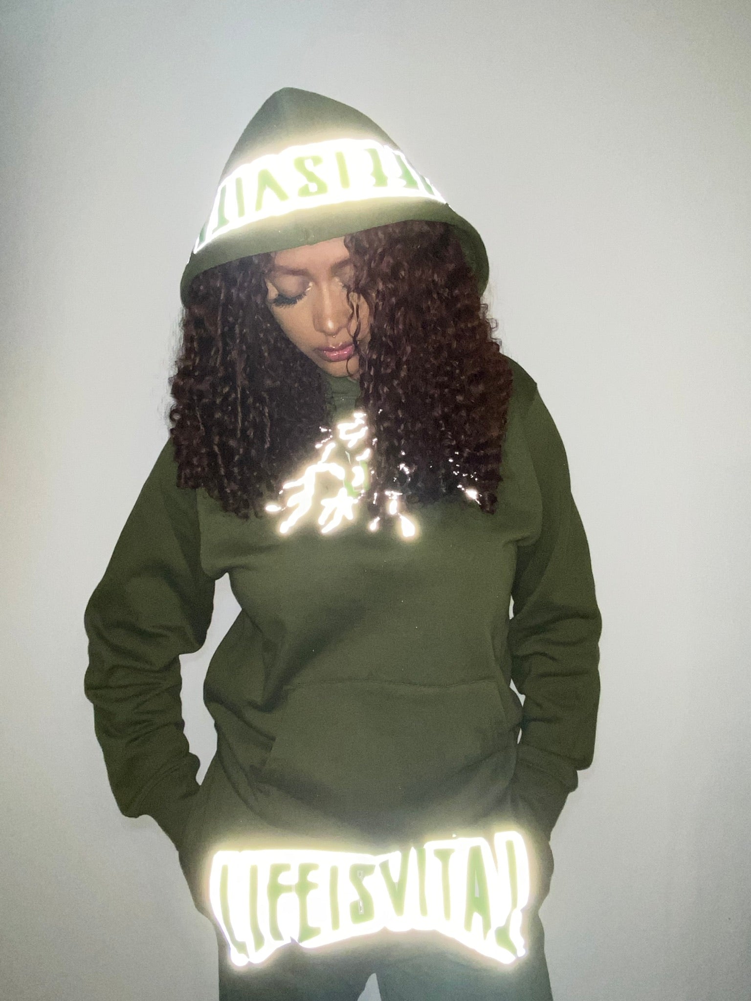 Lights, Camera, FLASH! Introducing our Reflective Sets. Our newest reflective material will turn heads day or night. Camera flash will cause reflection in any picture while natural light will cause reflection to the naked eye. Two piece olive green suit with lime green, white, and reflective grey lettering.