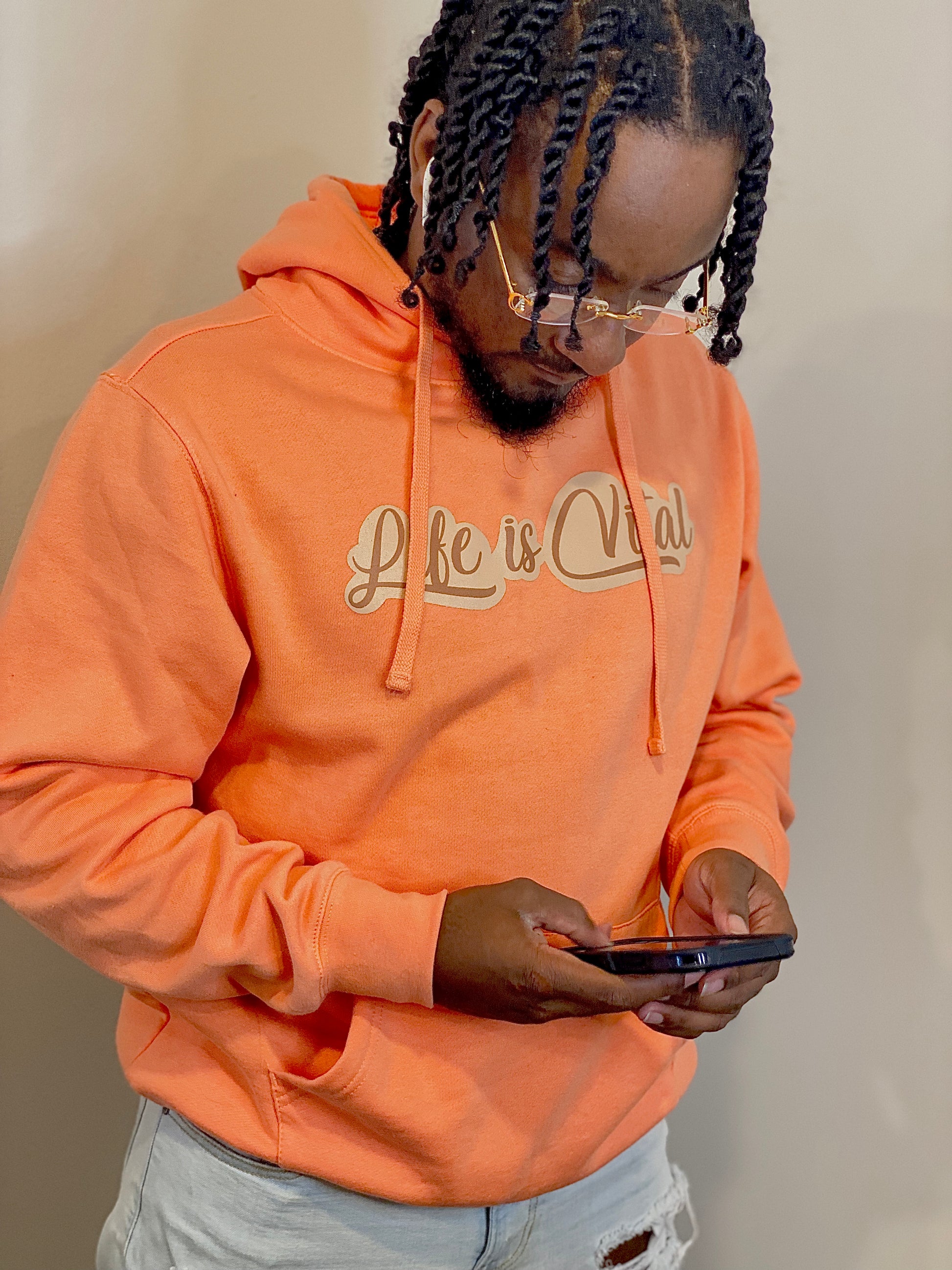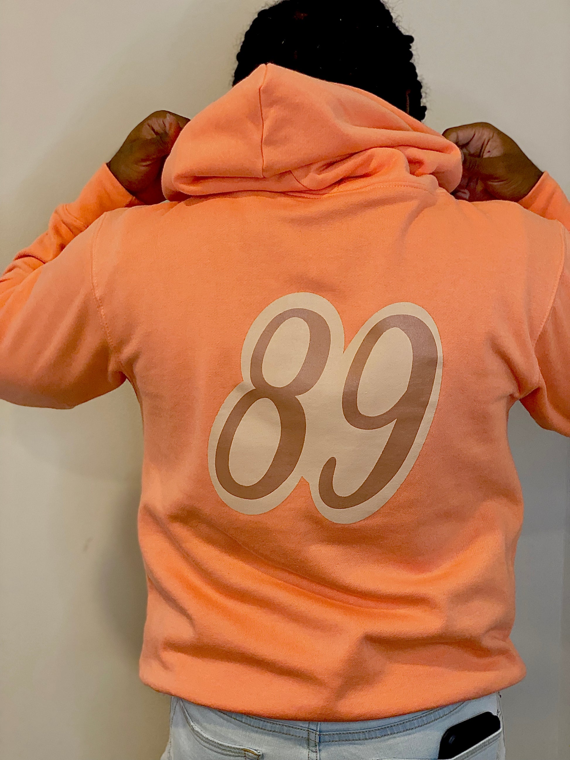 Our new VD style hoodie! Peach in color with cream and brown lettering. Fitted with our signature “89” on the back.